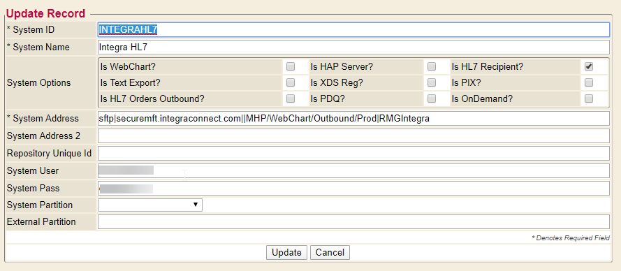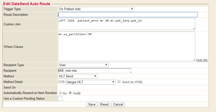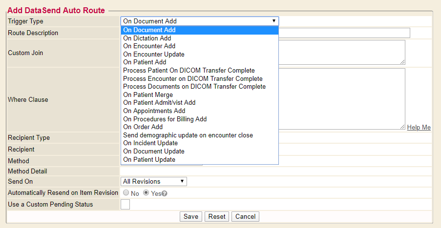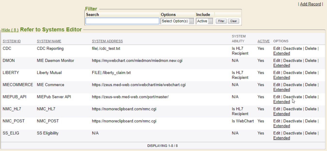 ## Overview 1. Understanding the end point to configure the Refer To Systems (RTS). 2. Understanding the trigger that will take place in Enterprise Health to send the data to the end point to configure the Auto Route. ## Refer To Systems Refer To Systems (RTS) is used to manage connection details for vendors/services that receive data from Enterprise Health. The RTS Editor is found in the Control Panel. It requires a permission level to access it. ![](./outbound-interface-install-instructions.assets/72d49a4da60ede7e9f94bdf983d46450.png) Each RTS entry contains: * System ID - This is a required unique identifier for the RTS * System Name - This is a human readable name for the entry. It is used when setting up Auto Routes and Performing Facilities on Lab Orders * System Address - This is the end point information. This can be a URL, Filename, SFTP, among others. * System Ability - This is a high level overview of what the connection is used for. HL7, Webchart to Webchart, among others * Active - This tells if the RTS is available for use. Inactive RTS cannot be sent to. * Options - This allows for Editing the RTS information, also to Deactivate, as well as Delete entirely. The Extended option is here as well to add special functionality when sending data over to this endpoint. ### System Address Here are the available connection options that the RTS editor supports ![](./outbound-interface-install-instructions.assets/723100db4503d34d573ec01166f3921f.png) 1. Socket a. Format: 'socket'|[IP address]|[port]|[SSL flag 1/0] ``` Example: socket|192.168.2.23|5321|0 ``` 2. File a. Format: 'file'|[file directory and name relative to where the datasend binary lives] ``` Example: file|../testfile.hl7 ``` 3. Multi-File a. Format: 'multi_file'|[file directory and beginning of filename to use] ``` Example: multi_file|../testmultifile ``` 4. SCP a. Format: 'scp'|[IP/hostname]|[port]|[subdir name]|[base filename]|[keyfile] i. Note username/password are on the RTS entry itself ``` Example: scp|192.168.34.27||data/outbound|testfile.dat| ``` 5. SFTP a. Format: 'sftp'|[IP/hostname]|[port]|[subdir name]|[base filename]|[keyfile] i. Note username/password are on the RTS entry itself ``` Example: sftp|192.168.34.27||data/outbound|testfile.dat| ``` 6. HTTPS (default) a. Format: [URL]|[username CGI variable name]|[password CGI variable name]|[message CGI variable name] i. Note username/password are on the RTS entry itself ``` Example: https://mywebchart.com/omg/webchart.cgi|login_user|login_passwd|message ``` ### System Ability Here are the types of outbound messages that can be configured for each RTS endpoint. Selecting these determines how they are represented inside of Webchart and EH. ![](./outbound-interface-install-instructions.assets/92e9971f0032eafe76fe1f520a8a4a8a.png) 1. Is WebChart? a. For sending messages between 2 Webchart systems 2. Is HAP Server? a. Specifies that this can be used as a remote chart HAP System endpoint in the ChartTabs editor. 3. Is HL7 Recipient? a. For sending HL7 data to a system 4. Is Text Export? a. Specifies that this can be used as a Text Export endpoint in the Send dialog and Auto Routes editor. 5. Is XDS Reg? a. For sending via XDS. 6. Is PIX? a. Specifies that this is a PIX Manager and is suitable as an endpoint for performing ITI-9 PIX queries. 7. Is HL7 Orders Outbound? a. For sending HL7 Orders to a system 8. Is PDQ? a. Specifies that this a Patient Demographics Supplier and is suitable as an endpoint for performing ITI-21 PDQ queries. 9. Is OnDemand? a. Specifies that any outgoing XDR submissions are to be registered as On-Demand documents rather than static documents. ## Auto Routes There are many available triggers * On Document Add/Update - creates MDM, VXU or ORU * On Patient Add/Update - creates ADT * On Appointments Add - creates SIU * On Procedures for Billing Add - creates DFT ![](./outbound-interface-install-instructions.assets/8e32d4f5d4eff16fb06c8f84f057ad51.png) JOINs and WHERE clause * This allows for more filtering to work with specific sets of patients. Requires some understanding of the Webchart DB schema. Generally requires MIE EDI team to build. However, manually copying Auto Route JOINs and WHERE Clauses into new Auto Routes is also possible. * The Help Me feature allows non-power users to build their own commonly used Join/Where clauses. ![](./outbound-interface-install-instructions.assets/59a0d8603cce1b3d57bd468474affaf5.png) There are many available send options * HL7 Send - this will send out HL7 messages ![](./outbound-interface-install-instructions.assets/c33547588cf502a12090664e7feb0029.png) ## Testing and Verifying Once records are added into Webchart and the triggers are satisfied, the HL7 message should send out according to the RTS. To validate that the data was sent outbound successfully, browse to the DataSend Queue in Control Panel -> Interfaces. The Send Queue has reports that show the records * In Progress - messages currently being sent to the RTS End point * Pending - messages waiting to be sent to the RTS End point * Error - messages that were unable to send successfully * Completed/Acknowledged - messages that were sent successfully ![](./outbound-interface-install-instructions.assets/3419ef2e1d3141f5c0dd86c3f1216ea1.png) Resending messages is possible for Completed messages using the Options *Resend* link ![](./outbound-interface-install-instructions.assets/cd194d4525be59d9453a9406d22038ef.png)